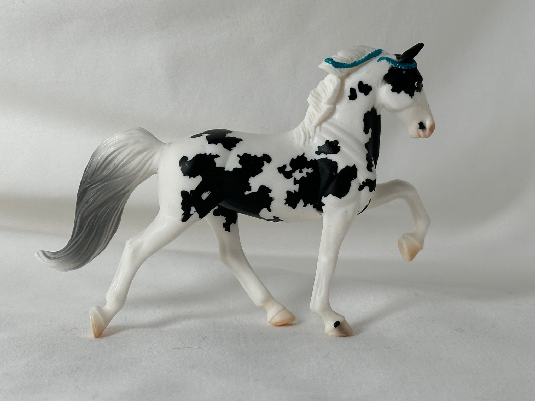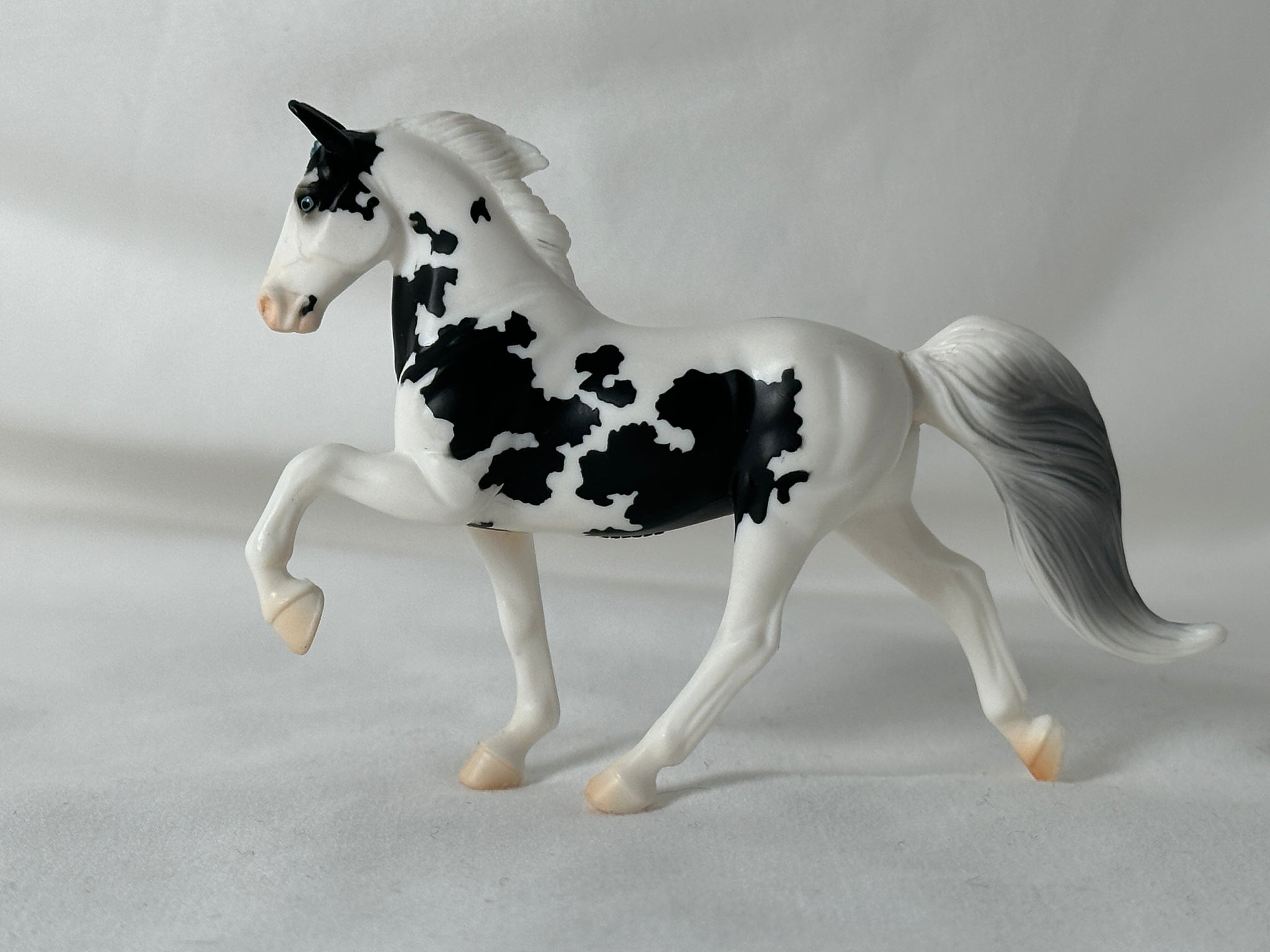 One blue eye, one brown eye, and a striking black and white tobiano pinto coat makes this girl a standout! Very pretty blue ribbons, and comes with her original viewing box and oute/Users/julianichols/Downloads/IMG_0509 2.JPG