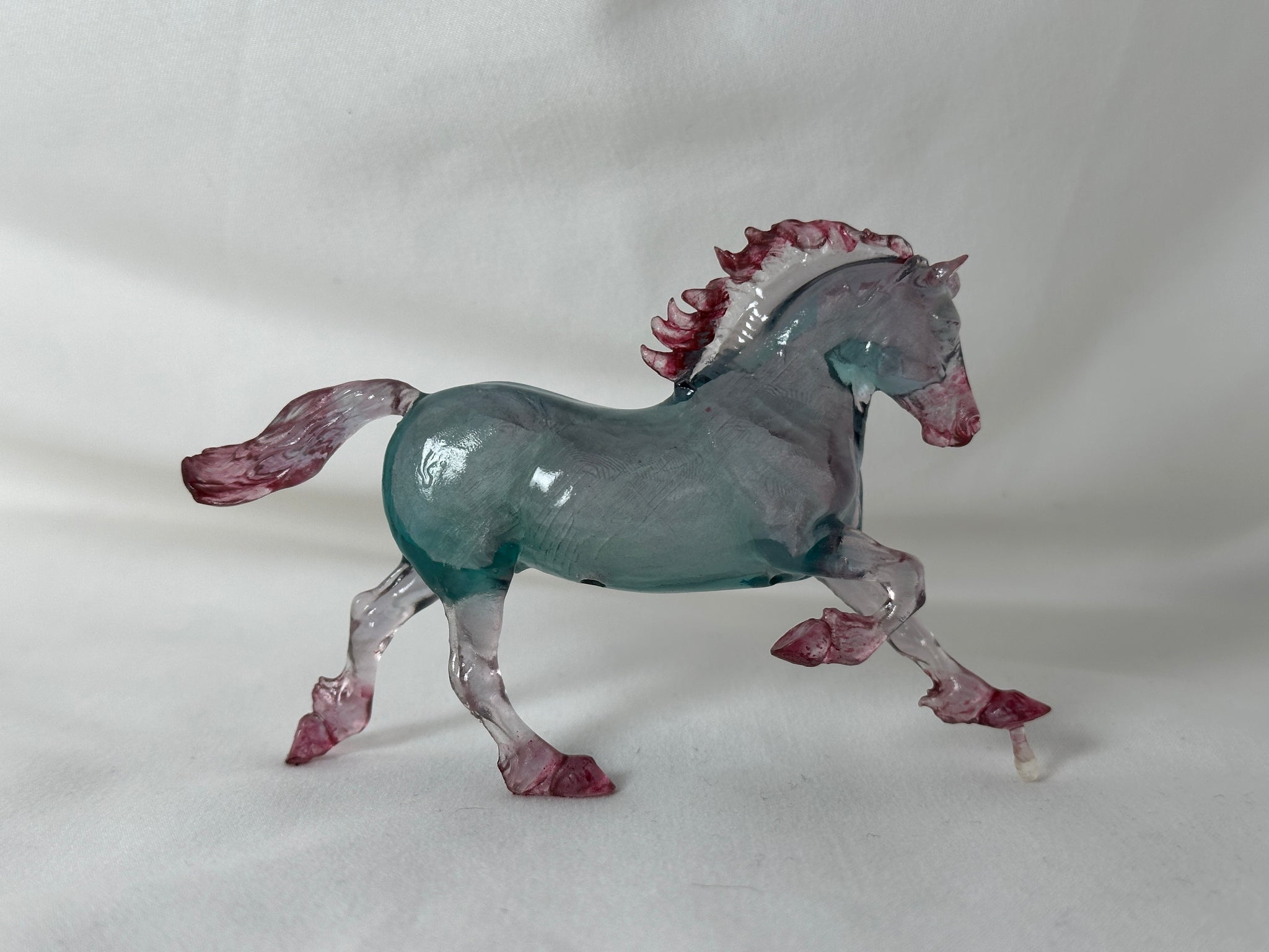 This is a sample piece of a 1/32 scaled hollow 3D printed Copperfox welsh cob. He was dyed in a green and red pattern to see how a holiday clearware would look. Finished in high gloss UV sealer. Has airholes in belly. Pin is molded on.
