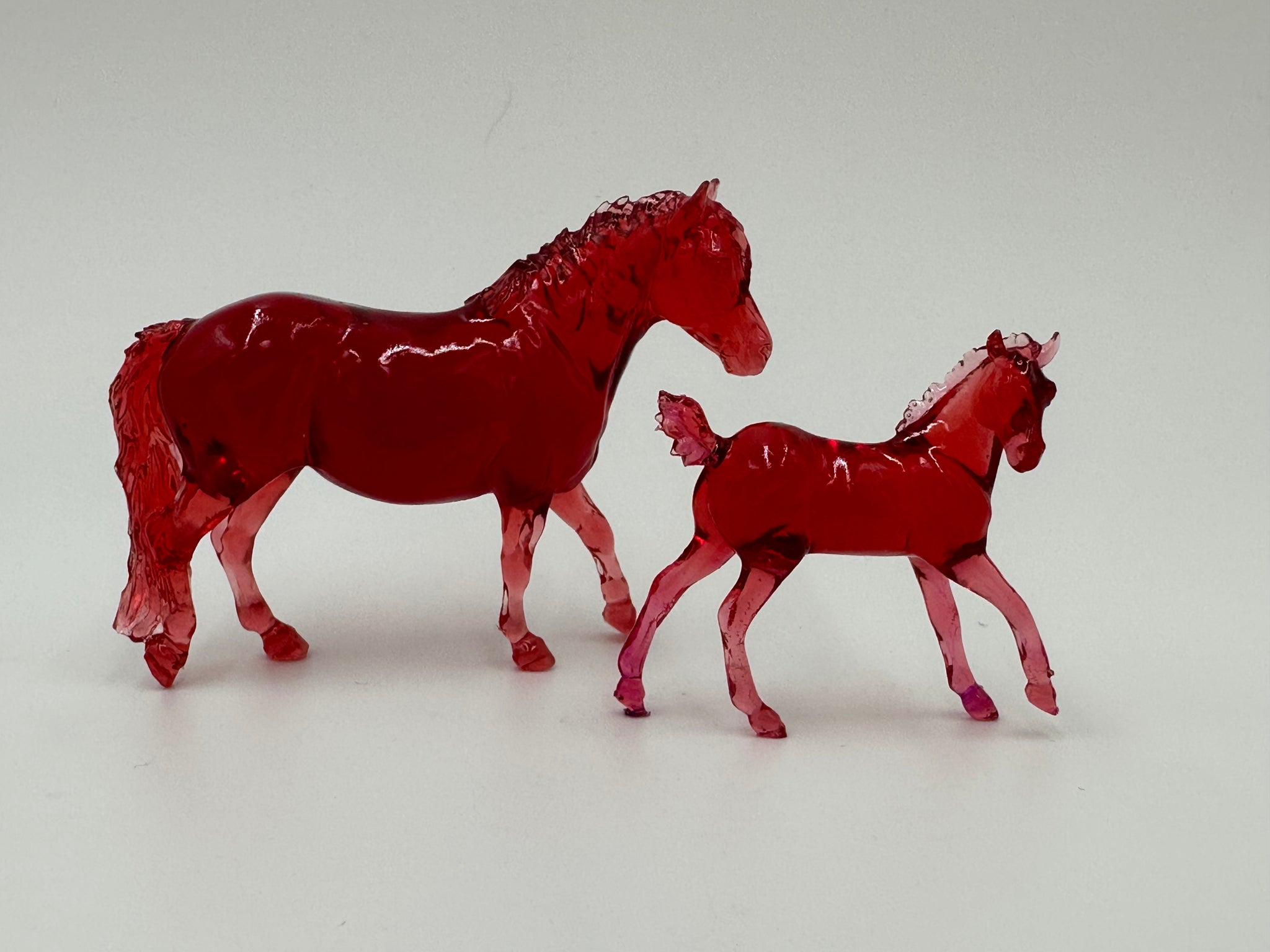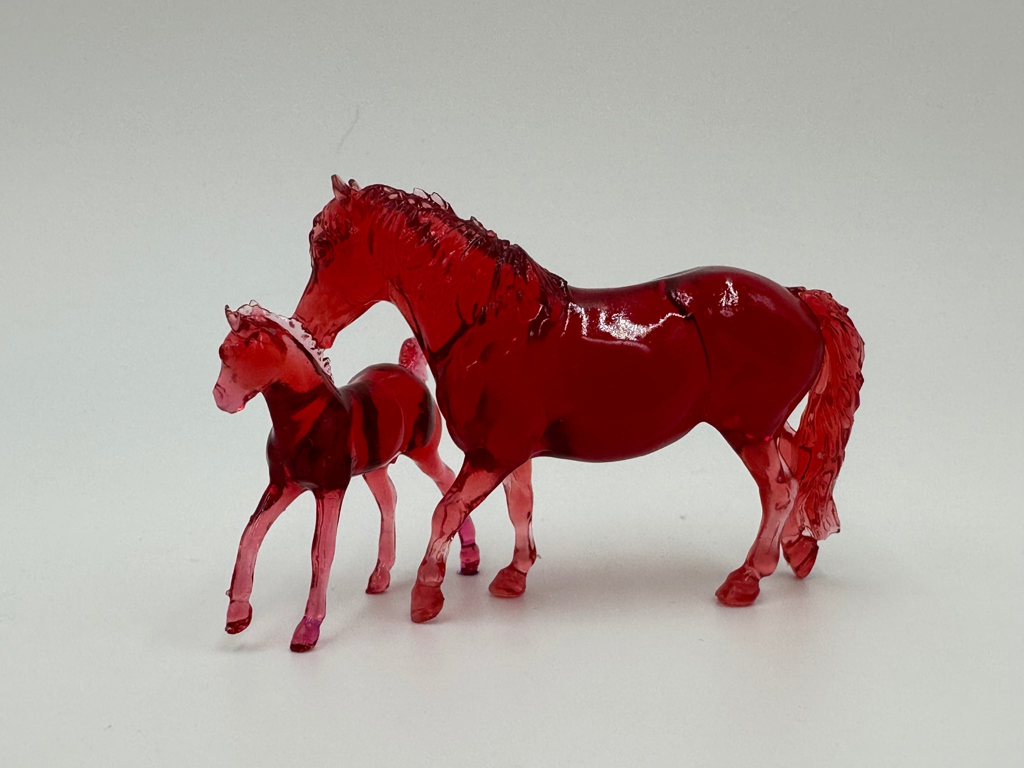 This is a cute deep red glossy mare and foal set, done in solid clearware. The foal is Otto, sculpted by Carly Kudalis, and the mare is the Exmoor named Sadie, sculpted by Harriet Knibbs. This is 1/32 scale, Coppercub size!